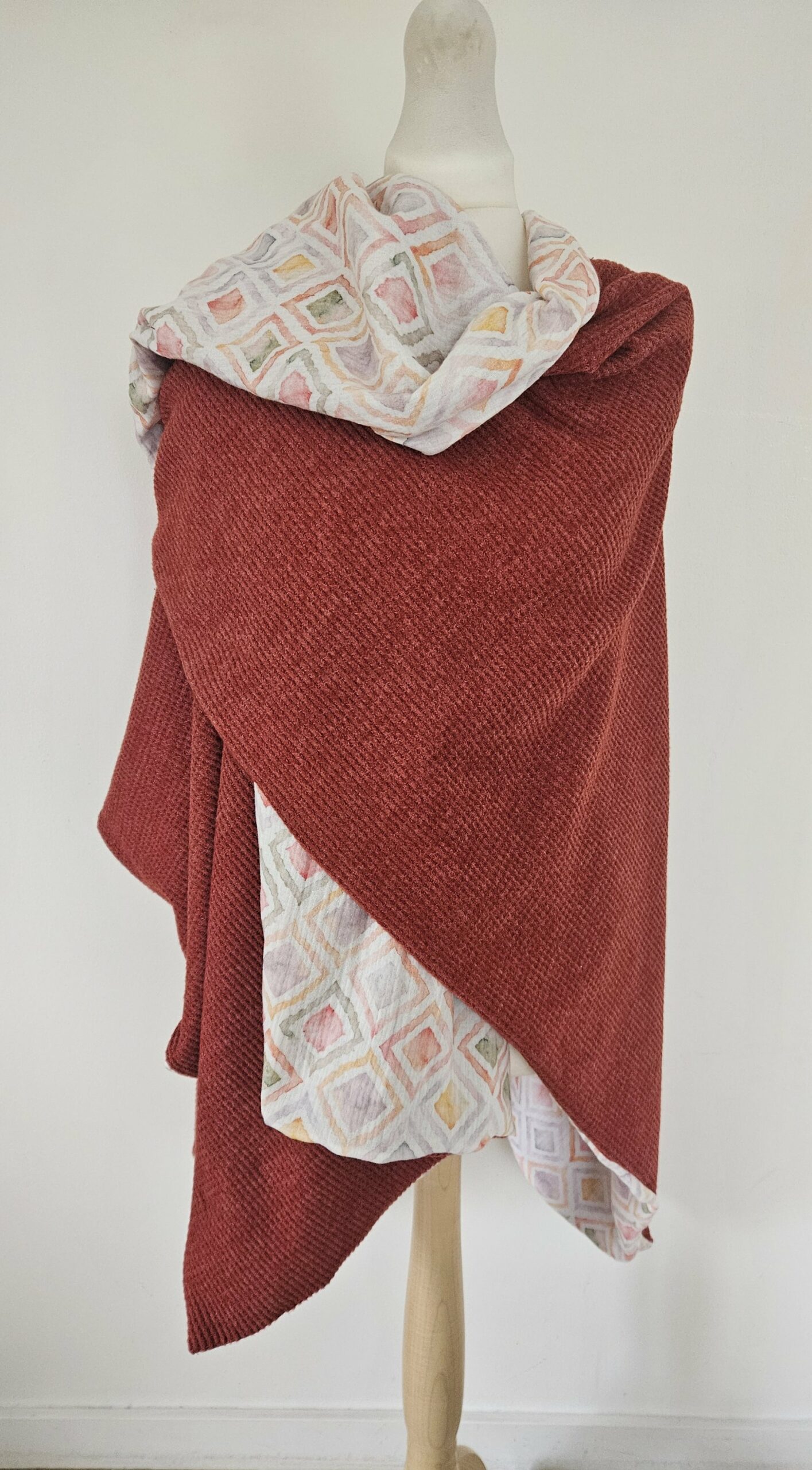 Cape en maille vert canard et viscose écrue et vert canard.