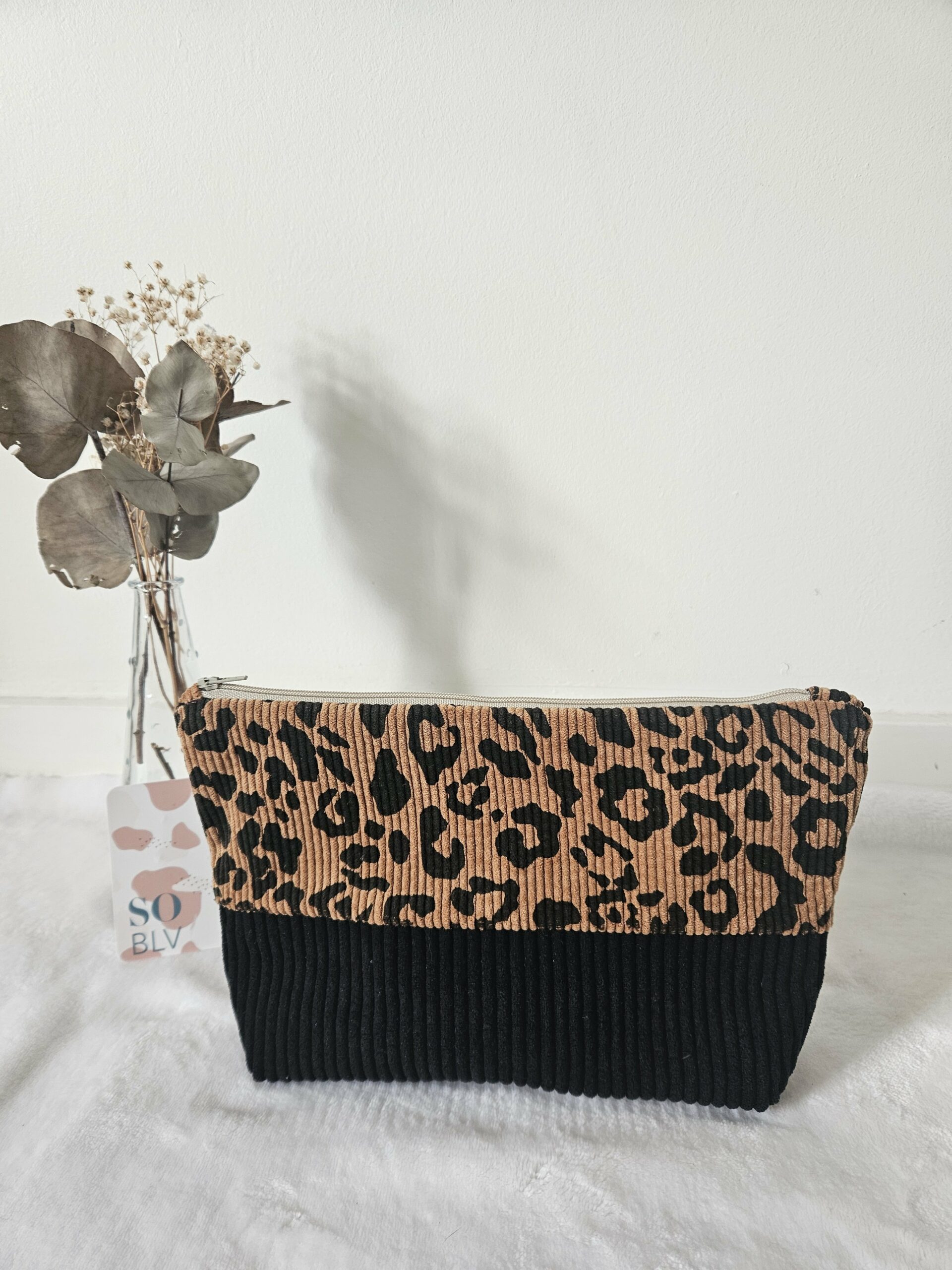 Pochette collection Girly en coton imprimé léopard et velours côtelé camel, doublé coton.
