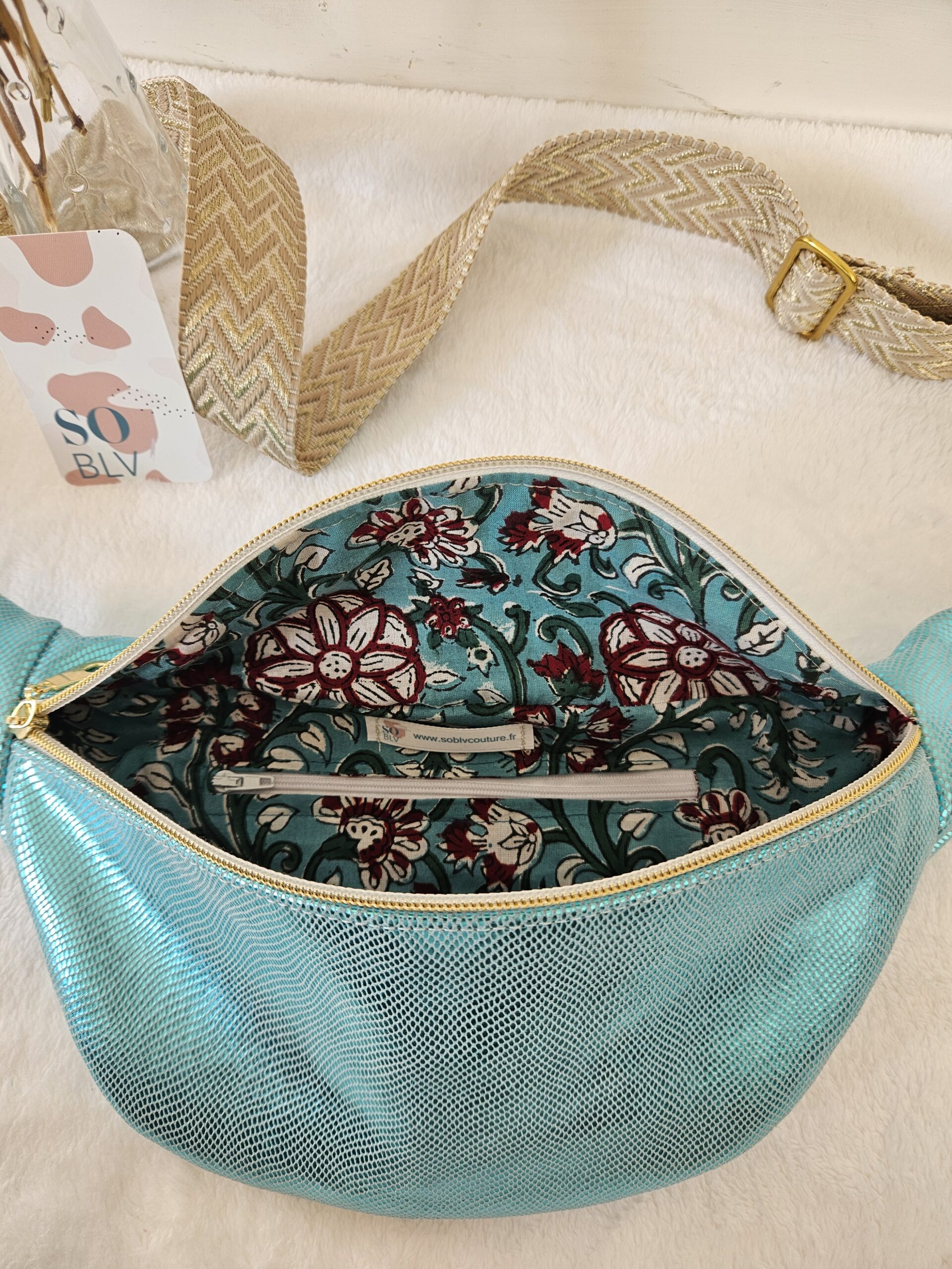 Sac Banane en CUIR de chèvre bleu turquoise métallisé et doublé coton indien