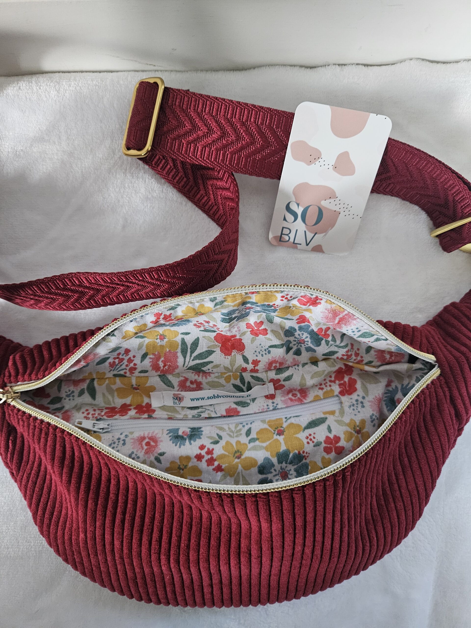 Sac Banane velours côtelé bordeaux intérieur coton fleuri