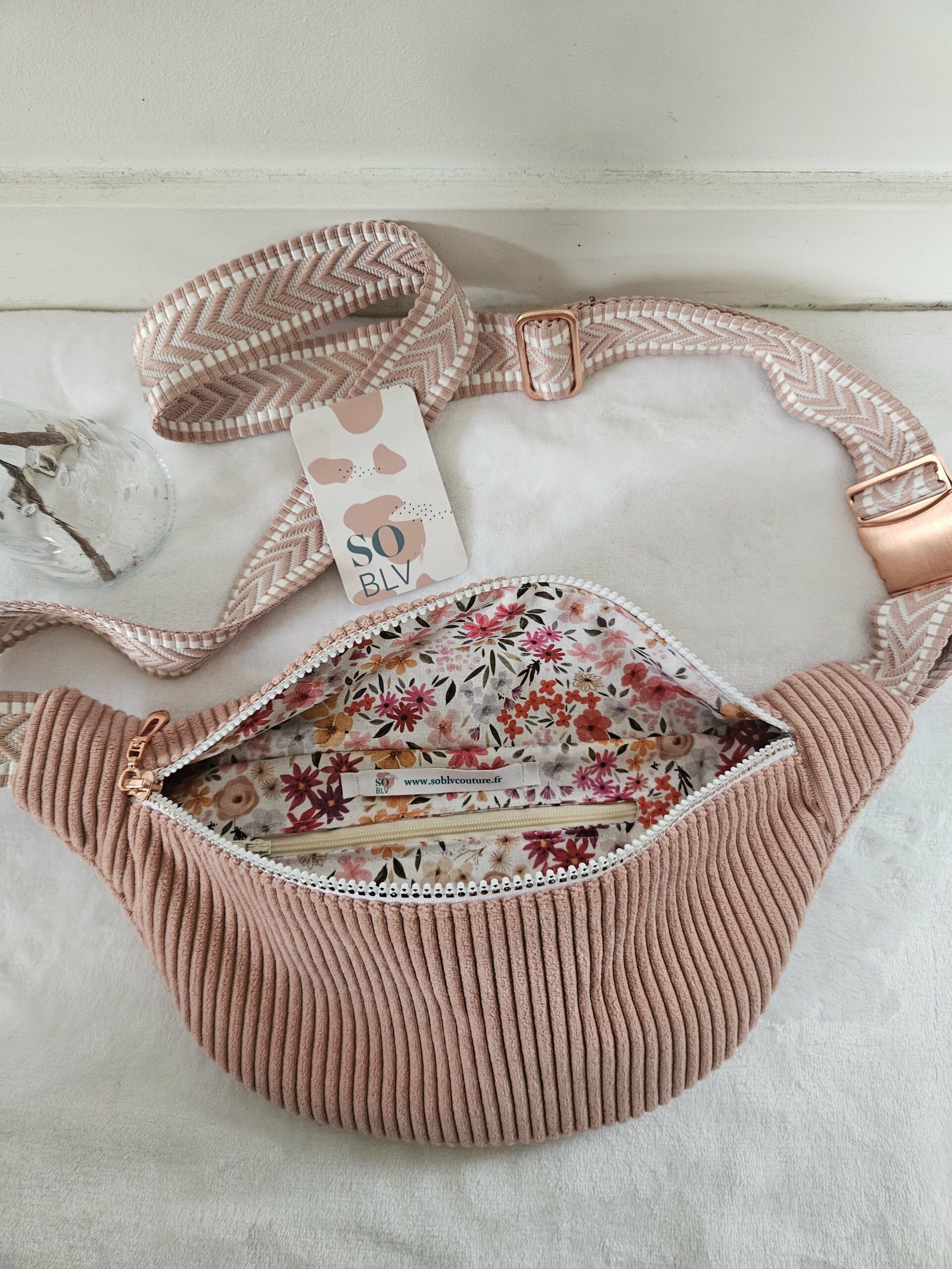 Sac Banane velours côtelé rose intérieur coton fleuri