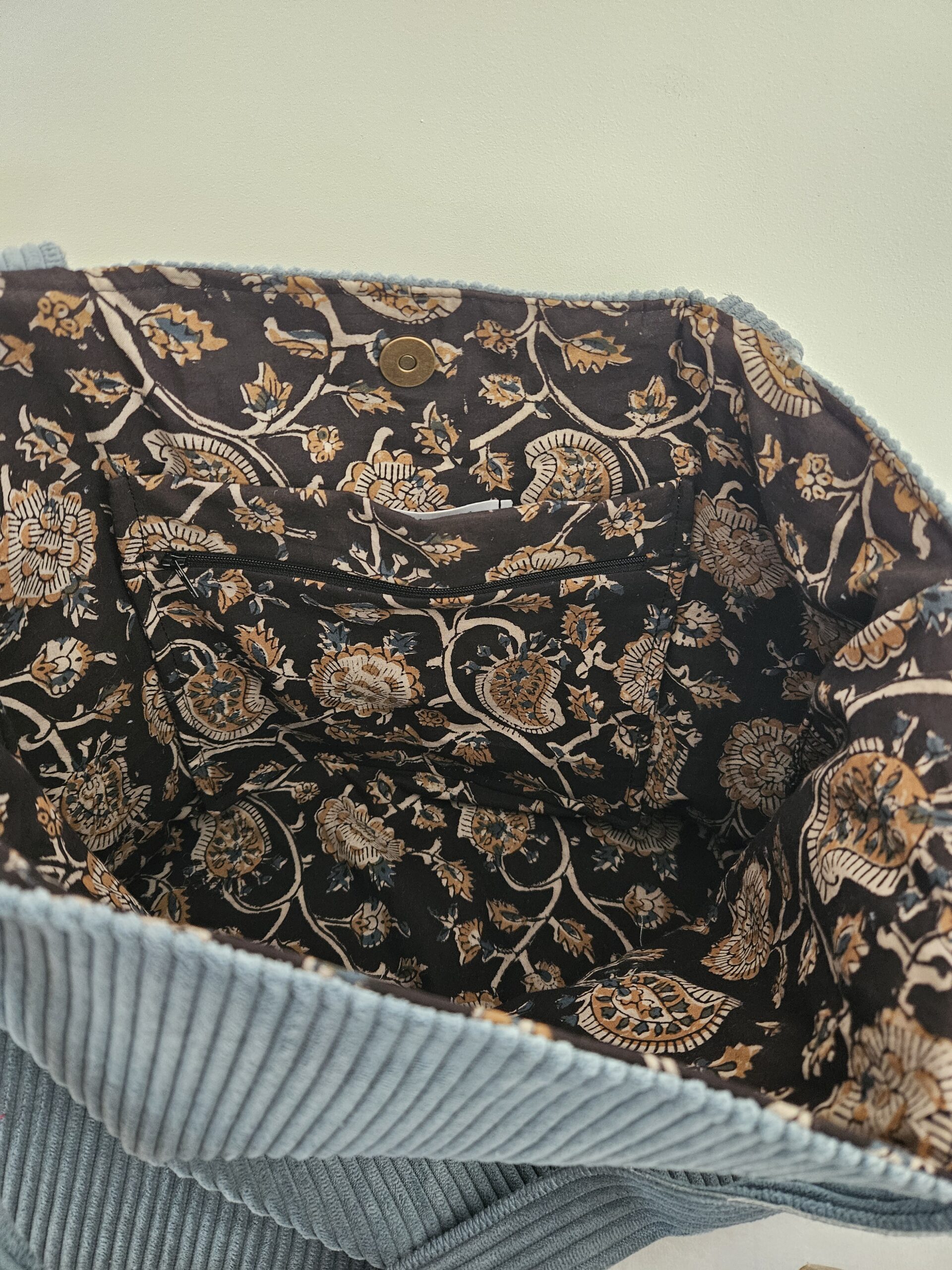 Sac Cabas en velours côtelé bleu intérieur coton indien