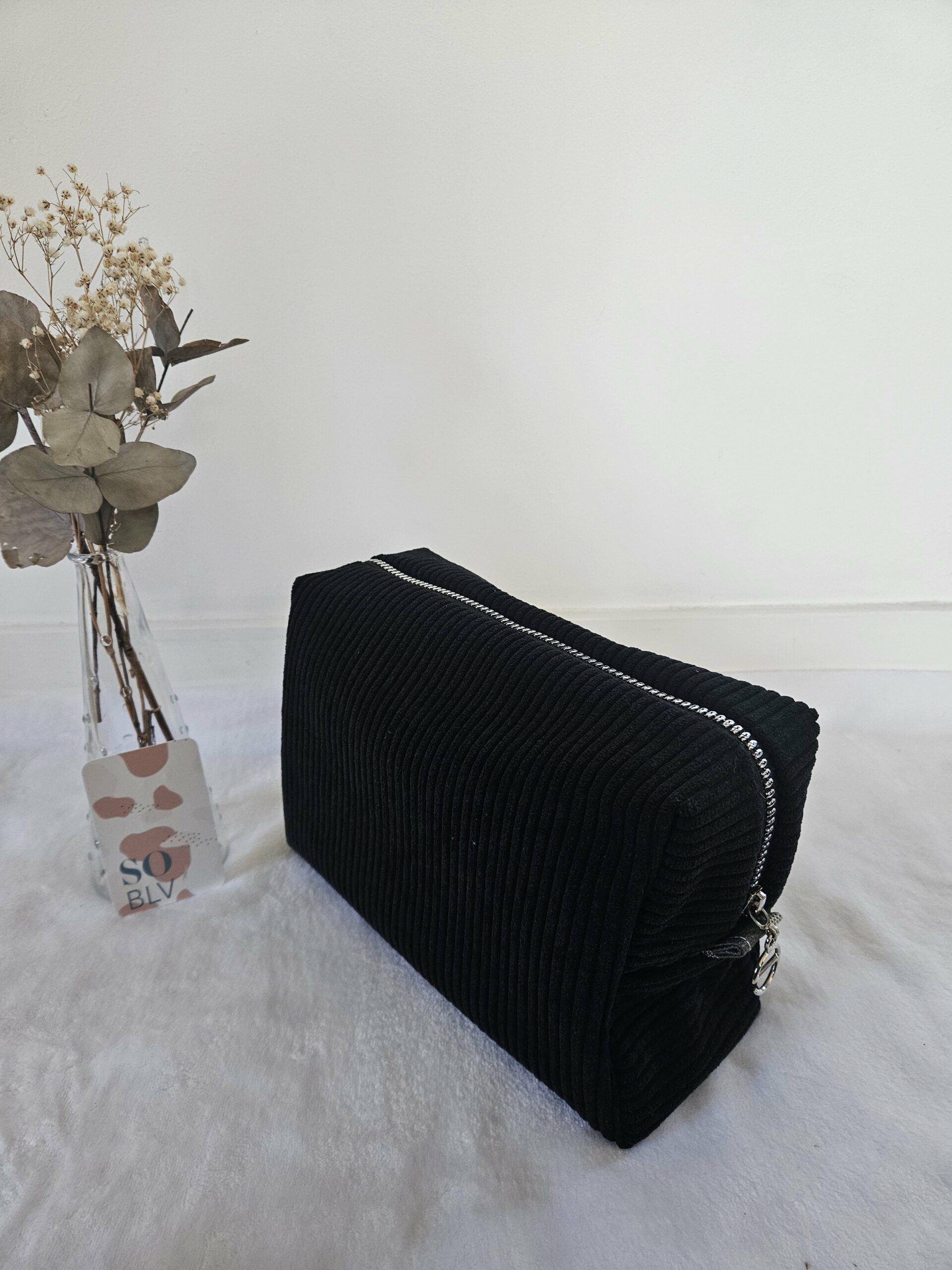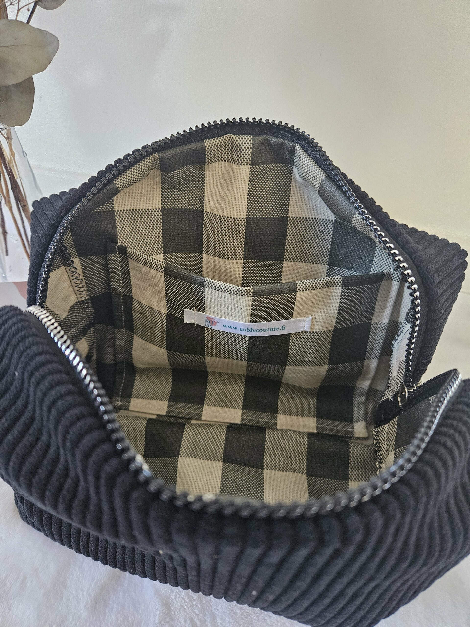 Trousse de toilette velours côtelé noir intérieur coton enduit kaki